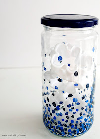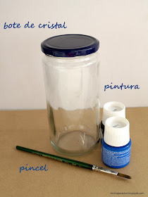 Desde que vi esta idea en Radical Possibility sabía que tarde o temprano la llevaría a cabo, aunque en este caso cambié los vasos por un bote. Y es que es tan fácil y el resultado es tan molón que vale la pena mancharse un poco las manos y conseguir que un bote de cristal cualquiera se convierta en ese bote bonito para guardar nuestras cosas; Porque, otra cosa no, pero botes de cristal tengo a montones, me da mucha pena tirarlos, los guardo siempre por si acaso se me ocurre alguna idea para poder darles una segunda vida digna.